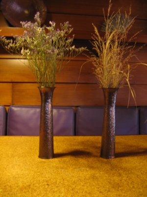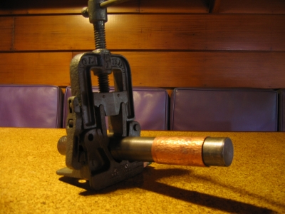 It was autumn at Touchstone Center for Crafts. The fall Demo weekend was taking place and the pickings were getting kind of thin for “Iron in the Hat”, but then my number was called. “It” had been overlooked by everyone and almost by myself, so I grabbed a 17 inch 2 inch diameter piece of round stock, not really sure what I would use it for, but I had my prize. I was a winner! So there it sat collecting dust and a little rust, and it moved to Wisconsin with me. Then the idea hit me, “Whoa, there it was all this time, a perfect stake for making small copper vases”. I had some 2 inch copper pipe and I placed it on the stake. It was a tight fit-no problem, taking a grinder I took some stock off, and the fit was ok. So I had a > 2 inch diameter stake and 2 inch diameter copper pipe, planishing hammer and a post vise to hold the stake (a pipe vise works also), and I started to lay down the line. First, I anneal the copper pipe then pickle, hit with either Scotchbrite or steel wool lightly, (this allows you to see your hammering better). By hammering from one end of the copper pipe to the other end you can see how straight your hammered lines are , if it’s not straight, again no problem, the next line can camouflage a crooked line to some degree. Hammering a straight line does take some practice. The hammering can be either vertical or horizontal in reference to the pipe. To break the visual lines, I place the now copper vase on the horn of the anvil. With a mallet lightly hit about a ½ inch down the vase while holding the piece up a bit on the horn, this will flare the ends of the vase. Next is a bottom. I take flat sheet copper that is a bit larger than the base of the vase, making sure that the bottom of the vase is square to the copper sheet with no visible gaps. Placing base on a piece of sand paper, in a figure 8 motion, knock off the high spots.. Now you’re ready to silver solder the bottom … make sure that it is a tight fit … no gaps. Then trim the excess sheet off and carefully grind off copper. Now you’re ready for Patina. A 12 inch X 2 inch diameter, cut piece of stock goes for around $30. (Right) - Completed vase is 2 inches in diameter by 5 inches tall