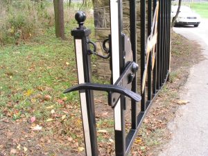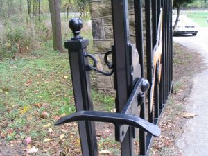 Consider using black reflective tape if you are building something that could be a night-time hazard. The tape also comes in a wide array of colors and also in bronze. Photograph on left is taken without flash, photo on right with flash. This latch assembly was designed to be opened or locked from either side of the gate. Gary used traditional forging techniques to complete this part of the project.