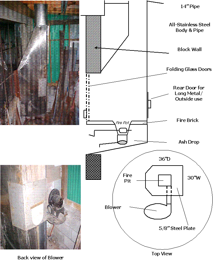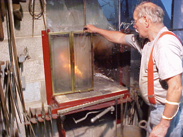By placing a large door on the rear of the forge, it would let long pieces through and the forge could be used from the outside in warm weather as well by adding another control to the rear. I built the unit with an 5/8” steel shelf including a tong rack and a stainless steel body, with a 15” stainless steel chimney pipe on the outside of the building. The blower is mounted 2 feet from the fire pot outside of the hood providing lots of direct air. A pull-out air control lever handle was used; it can be pushed back in with my leg when hot items are removed, leaving hands free. Glass doors were added to keep the heat inside when not in use and heat from the forge to the outside when working. |